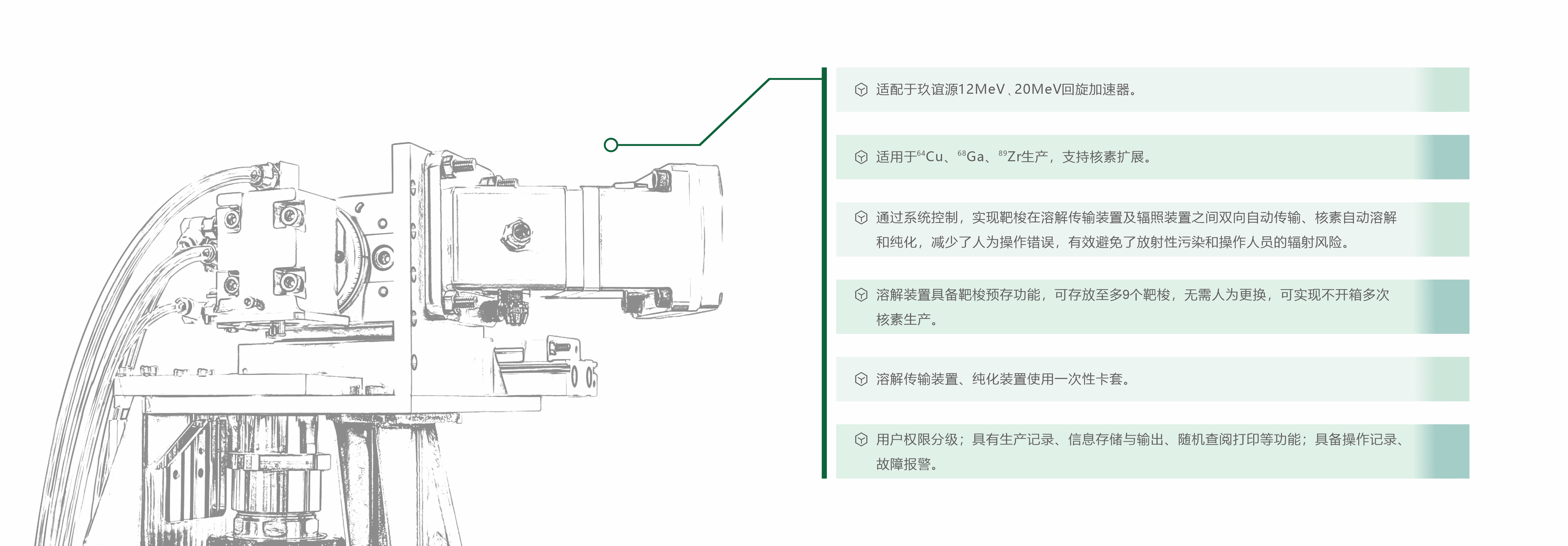 能夠在封閉環(huán)境下自動(dòng)完成從靶件傳輸輻照到放射性同位素純化的一系列操作,系統(tǒng)自動(dòng)化程度高,減少了人為操作錯(cuò)誤,有效避免了放射性污染和操作人員的輻射風(fēng)險(xiǎn),可提升實(shí)驗(yàn)的重復(fù)性和準(zhǔn)確性,同時(shí)還具備手動(dòng)操作模式以應(yīng)對(duì)系統(tǒng)自動(dòng)運(yùn)行時(shí)出現(xiàn)的異常情況。